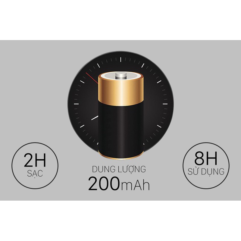 - Dung lượng pin 200 mAh, sạc 2 giờ sử dụng 8 giờ