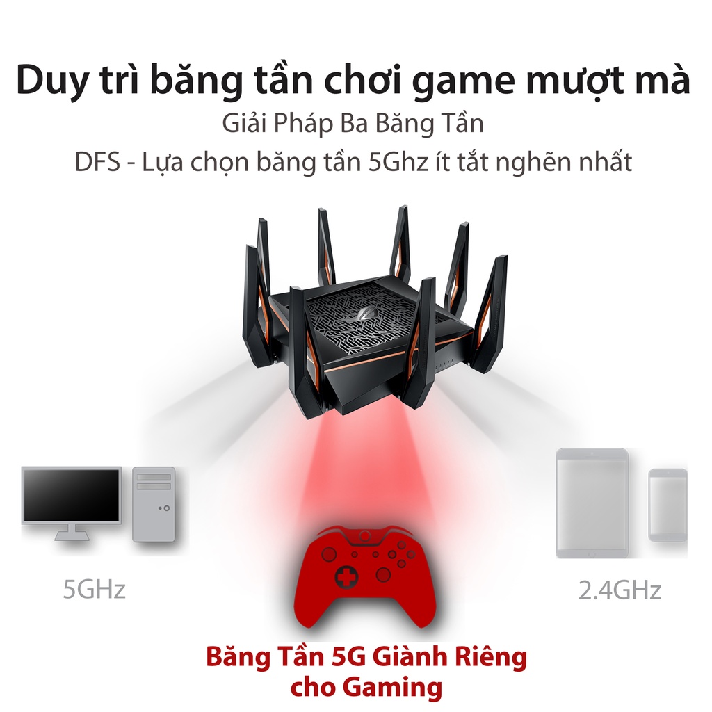 Mạng ba băng tần cho phép bạn dành một băng tần 5Ghz chỉ để chơi game, vì vậy bạn có thể tránh phải cạnh tranh băng tần với các thiết bị khác trên mạng nội bộ của bạn. Với tính năng lựa chọn tần số động (DFS), ROG Rapture GT-AX11000 cũng mở khóa 15 kênh trong các băng tần 5Ghz ít tắc nghẽn nhất, cung cấp thêm băng tần cho tất cả các thiết bị không dây của bạn.