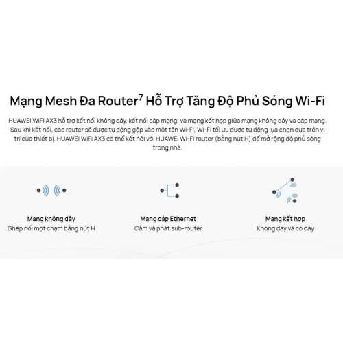 - Tính năng phần mềm: APP: HUAWEI AI Life App, Huawei Share (Tap to Connect), Huawei HiLink & 802.11v protocol, IPv4 / IPv6, PPPoE / DHCP / static IP address / Bridge WAN connection methods, Wi-Fi timer, Guest Wi-Fi, Device speed limiting, MAC address filter, Parental control, VPN pass through, DMZ / virtual server…