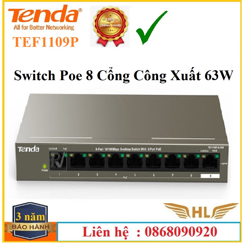 Máy tính & Laptop > Thiết Bị Mạng > Bộ chia mạng || [Mã 273ELHA100K0 hoàn 7% đơn 500K] Thiết Bị Switch Chia Mạng Cấp Nguồn PoE Tenda TEF1109P-8-63W Hàng Chính HãngCòn hàng