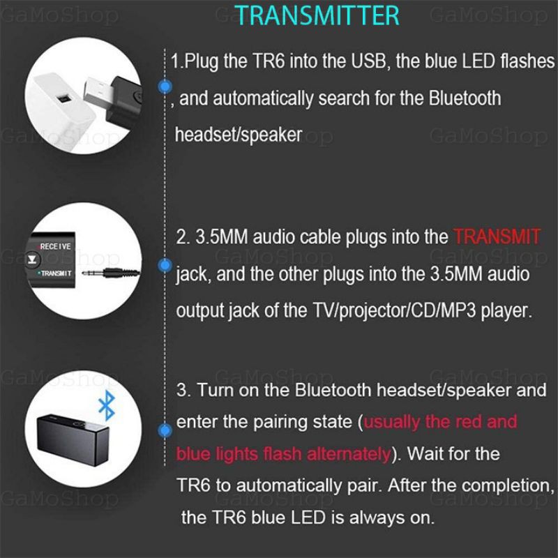 + Cắm rắc 3.5 vào cổng Transmit của thiết bị, đầu còn lại cắm vào cổng tai nghe của tivi, đèn Transmit nhấp nháy