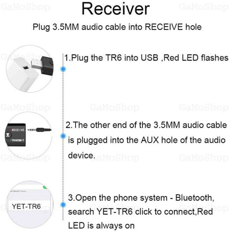 + Mở Bluetooth của điện thoại tìm kiếm và kết nối giống như kết nối tai nghe bluetooth thông thường. Đèn Receive đứng yên là đã kết nối thành công.