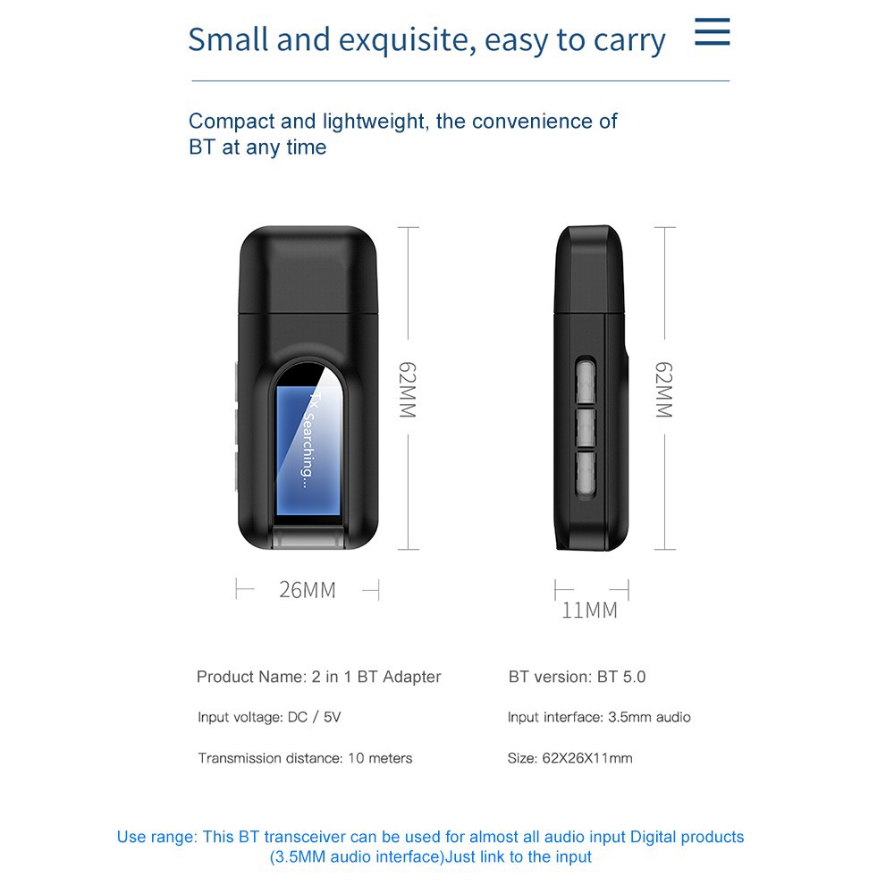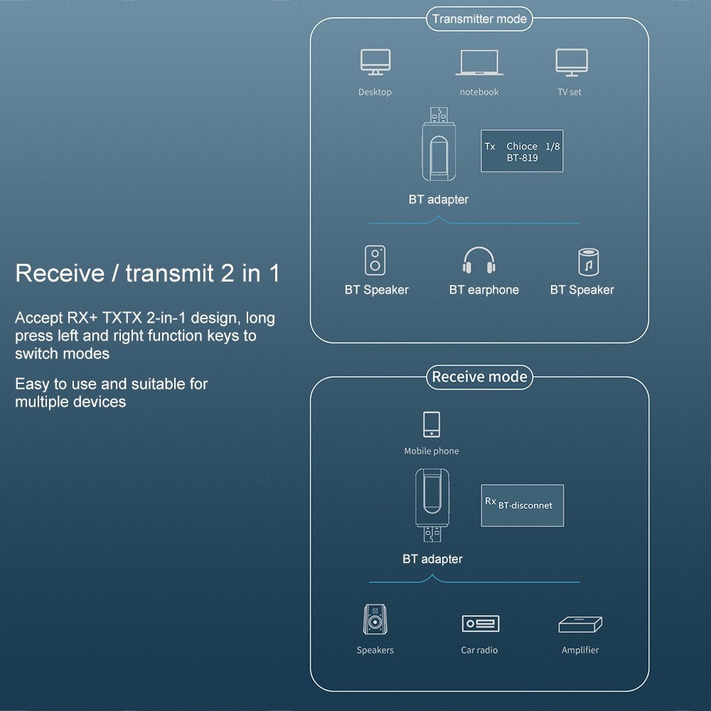 Chế độ máy phát: Truyền không dây âm thanh từ TV không BT, hệ thống âm thanh nổi tại nhà hoặc đầu CD sang tai nghe hoặc loa BT; Chế độ thu: Chuyển âm thanh không dây từ điện thoại, máy tính bảng hoặc máy tính hỗ trợ BT sang loa hoặc tai nghe có dây.