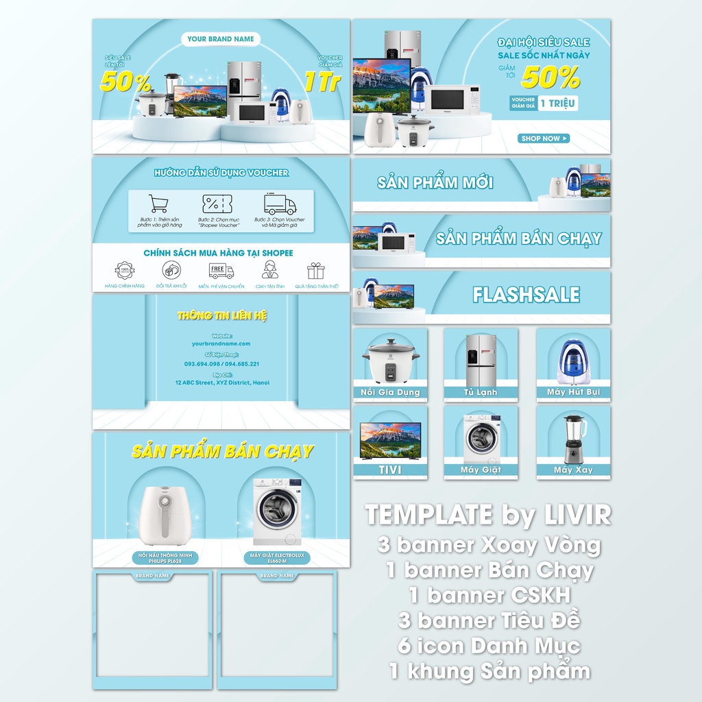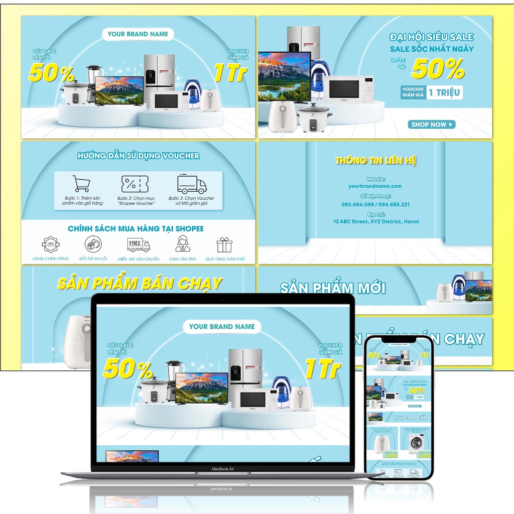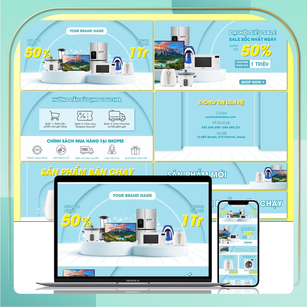Thiết kế Template trang trí gian hàng Đồ gia dụng - Màu xanh tươi mát hiện đại của Livir được thiết kế chỉn chu và chuyên nghiệp sẽ giúp gian hàng Shopee của bạn sẽ tạo ấn tượng tốt trong mắt khách mua hàng. Đặc biệt, khi có một gian hàng đồng bộ, chỉn chu, bạn sẽ tăng khả năng khách hàng xem sản phẩm và từ đó, tăng tỷ lệ chuyển đổi.🛒 Sử dụng mẫu thiết kế gian hàng từ Livir, bạn có thể: