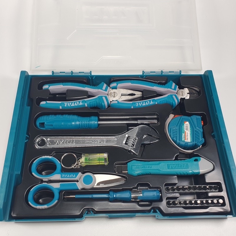 [ THKTV02H291 ] Bộ 29 dụng Cụ cho gia đình kèm hộp ghép tầng TOTALBộ 29 công cụ gồm: 1 kềm răng 7 inch1 kềm cắt 6 inch, 1 mỏ lết 8 inch, 1 bút thử Điện áp thửnghiệm 100-500VAC, 1 thước kéo 3M, 1 lưỡi dao,1băng cách điện PVC, 1 mũi từ 1/4 inch20 mũi vít size :SL3, SL4, SL5, SL6, PH0, PH1, PH2,PH3, PZ0, PZ1, PZ2, PZ3, T10, T15, T20, T30, H3, H4,H5, H6 25mm, 1 thước thủy.