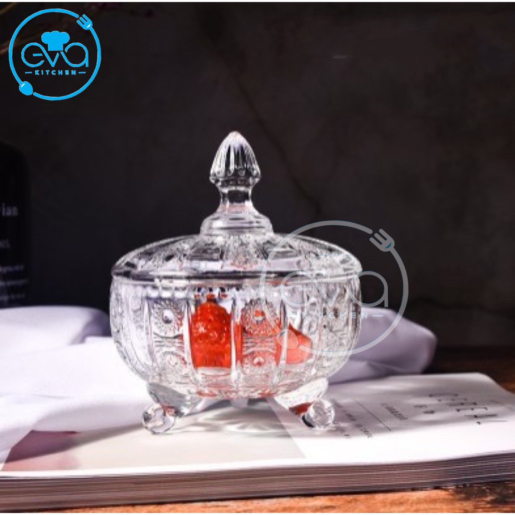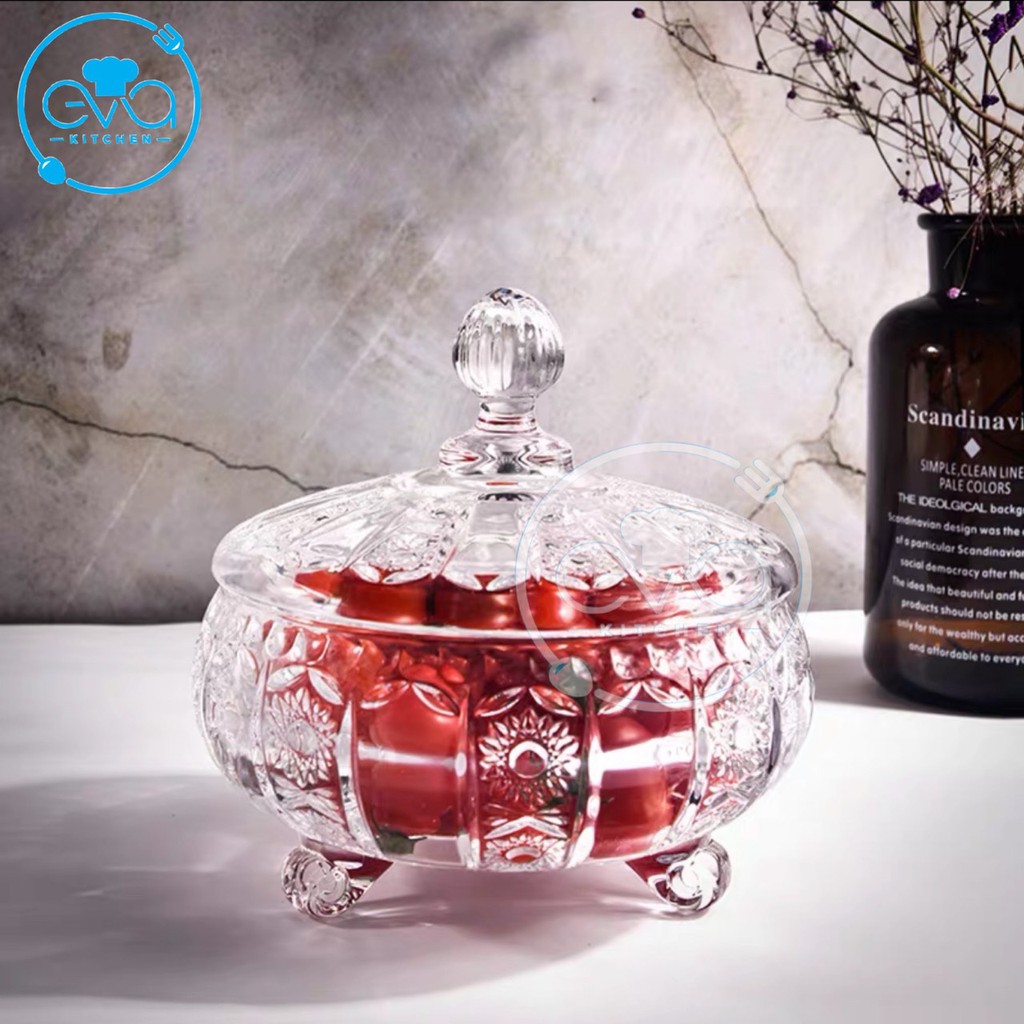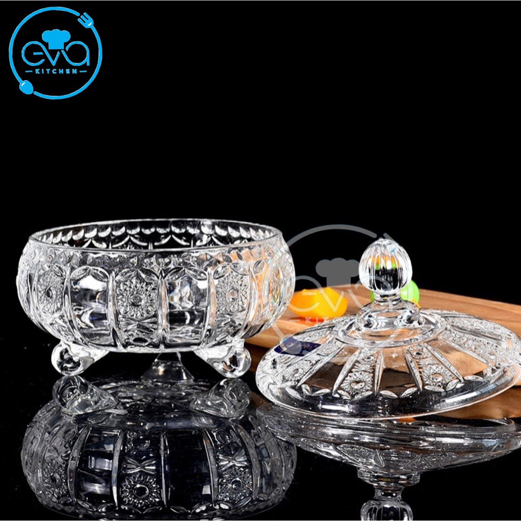 Thố Mứt Thuỷ Tinh Pha Lê 3 Chân Hoạ Tiết Hoa Nổi Nhỏ Phong Cách Royal Sang Trọng / Thố Mứt Tết Nhỏ Deli Tiệp T15 M3171