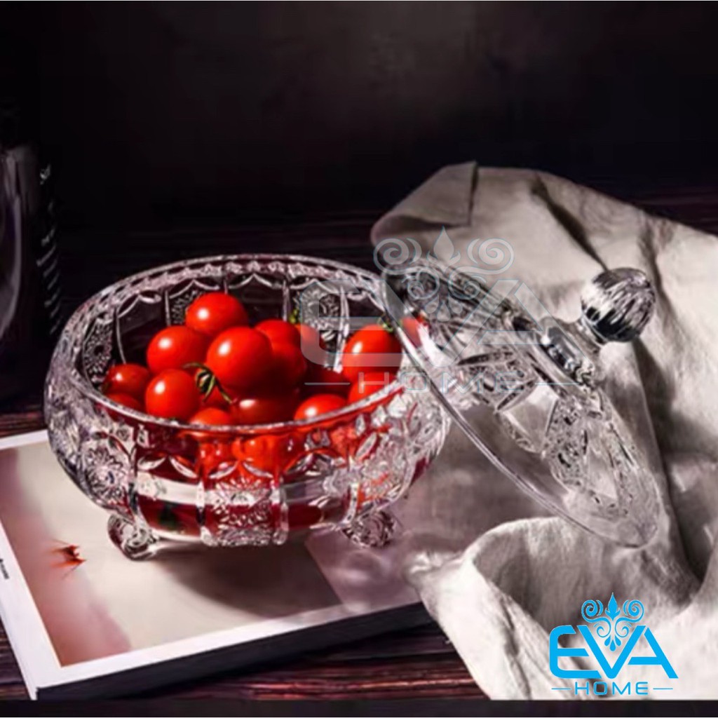 Thố Mứt Thuỷ Tinh Pha Lê 3 Chân Hoạ Tiết Hoa Nổi Lớn Phong Cách Royal Sang Trọng / Thố Mứt Tết Lớn Deli Tiệp T16 M3170