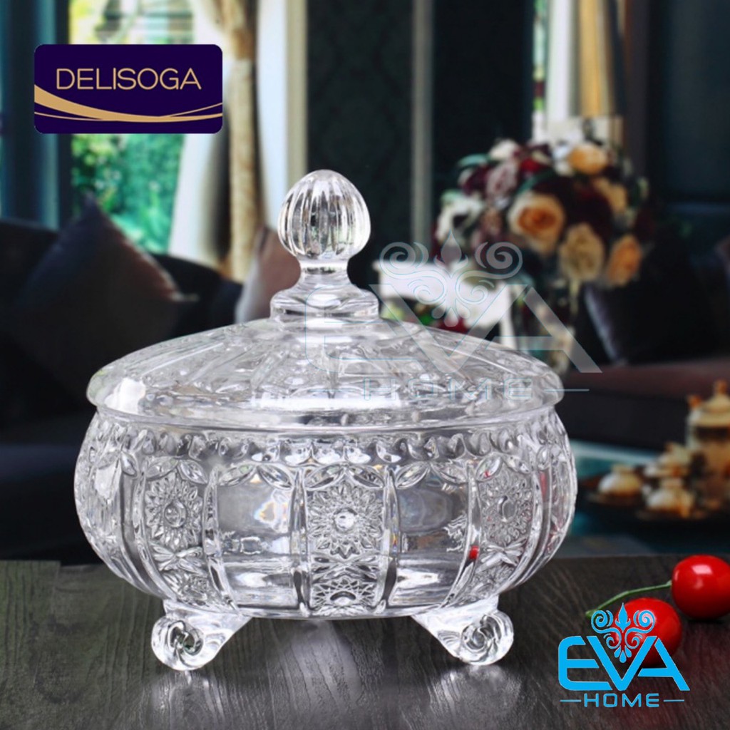 Thố Mứt Thuỷ Tinh Pha Lê 3 Chân Hoạ Tiết Hoa Nổi Lớn Phong Cách Royal Sang Trọng / Thố Mứt Tết Lớn Deli Tiệp T16 M3170Mã Sản Phẩm : 0090003170