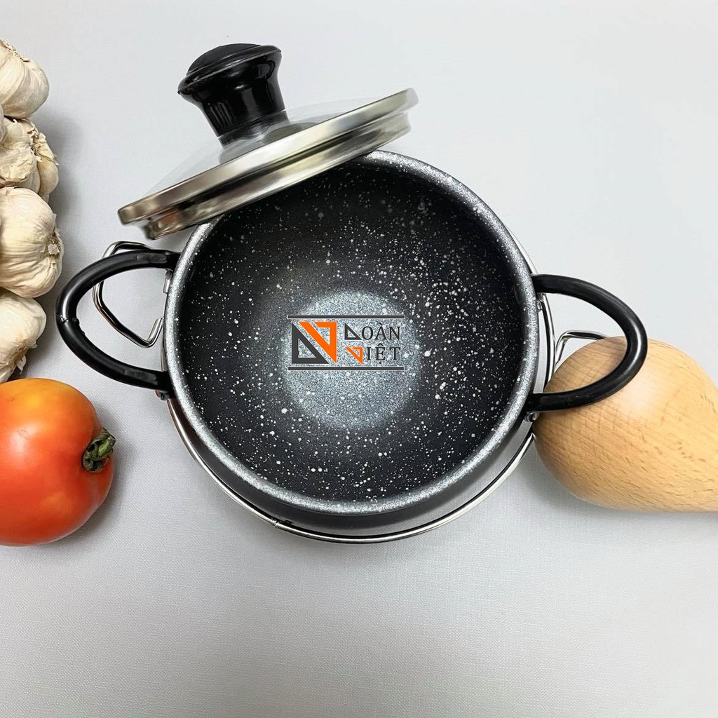 Nồi Cơm Niêu mẫu MỚI SIÊU ĐẸP làm từ HỢP KIM NHÔM VÂN ĐÁ CHỐNG DÍNH [tặng ĐẾ LÓT INOX + VÁ GỖ CAO CẤP]. Thố NHÔM đức Nguyên Khối bởi công nghệ TIÊN TIẾN sản phẩm bền đẹp. Dụng cụ dùng Đa Năng KHO QUẸT, CƠM CHÁY giòn đều THƠM NGON.Ưu Điểm: