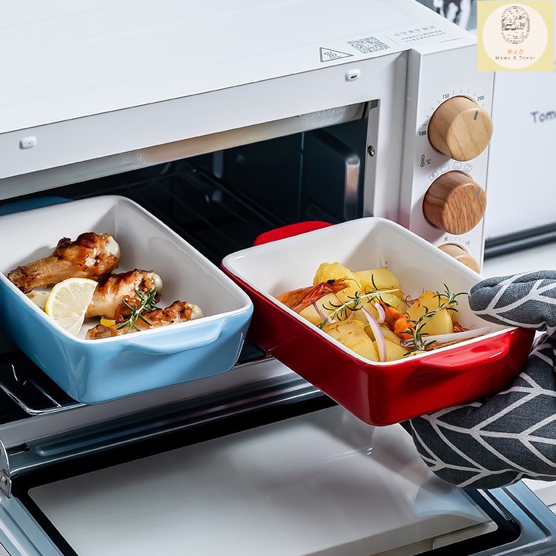 - Chất liệu:Gốm sứ, có tay cầm 2 bên giúp dễ lấy đồ khỏi lò nướng/nồi chiên.