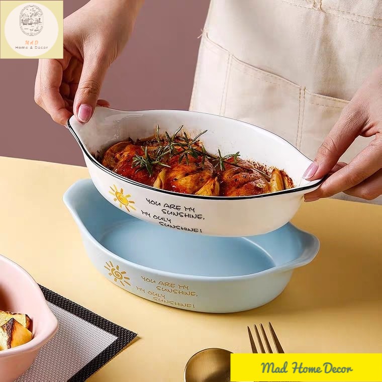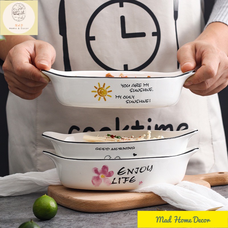 ▪️Chất liệu: gốm sứ, hoa văn vintage vẽ tay, có tay cầm 2 bên giúp dễ lấy đồ khỏi lò nướng/nồi chiên.