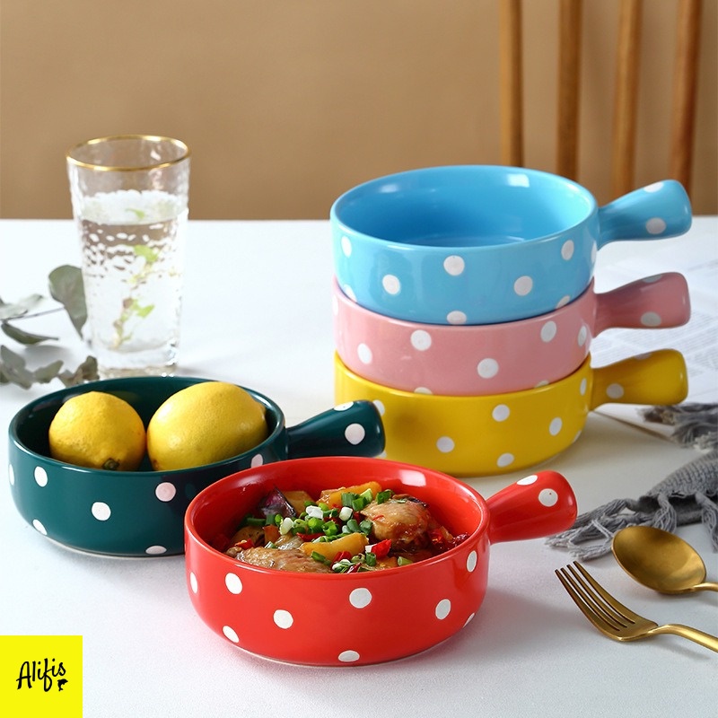 Thố sứ có tay cầm, thố tròn cao cấp và khay hình chữ nhật họa tiết chấm bi - đồ dùng nhà bếp thông minh