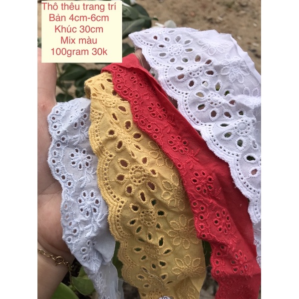Thô thêu trang trí như hinh bản 3cm-6cm (100g/30k trộn màu )Dùng trang trí váy áo cho bé ………