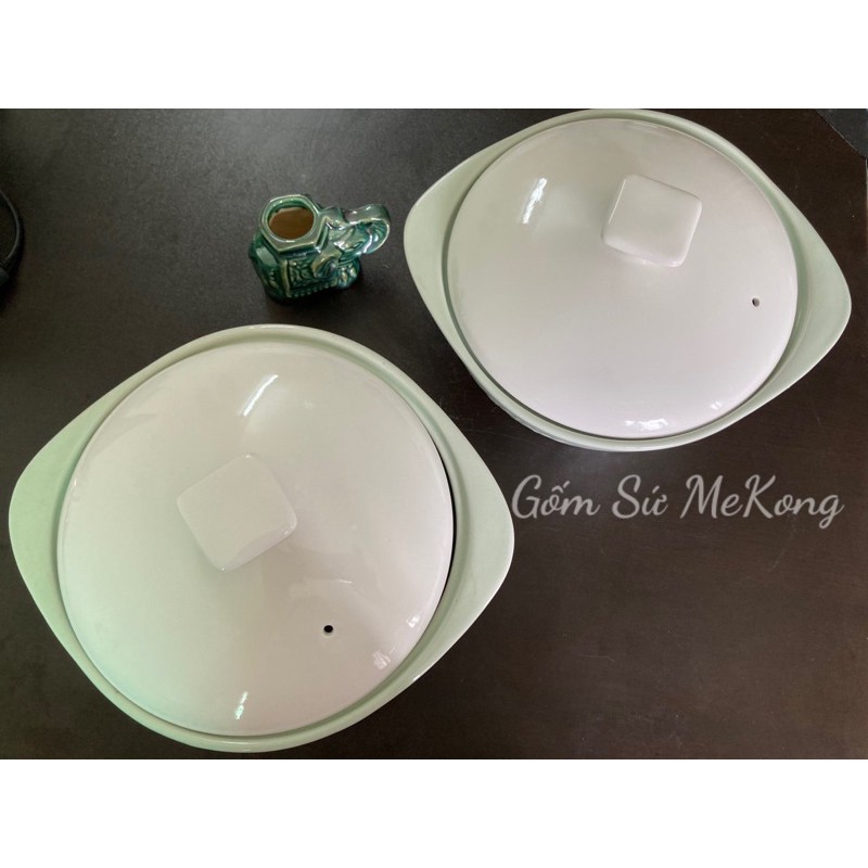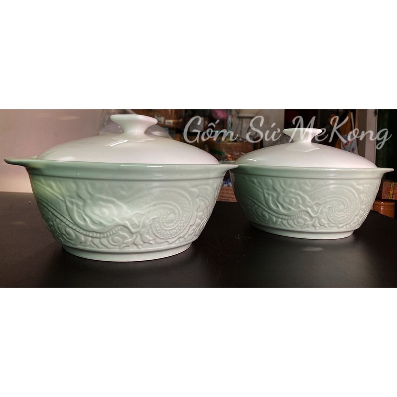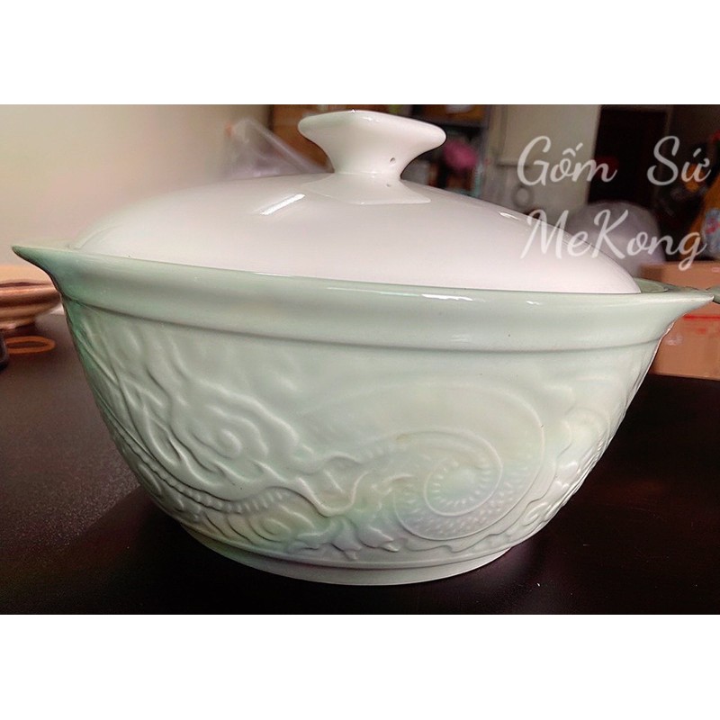 Thố / Tô đại bằng gốm sứ đựng thức ăn có quai bê, màu xanh đá dập rồng mây nổi rất phong cách & sang trọng đẹp mắt, chất sứ cao cấp chắc chắn 👉phù hợp sử dụng gia đình,nhà hàng,quán ăn...🌸Đường kính 22cm,cao 10cm cao chưa đo nắp, chiềubcao nắp thêm 6cm (nắp trắng hoặc vàng kem)
