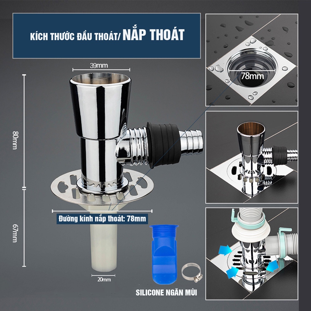 Chất liệu: Đầu nối thoát nước, Silicone: Nhựa dẻo, nắp có khe thoát nước sàn bằng Inox (đường kính 7.8-8cm)