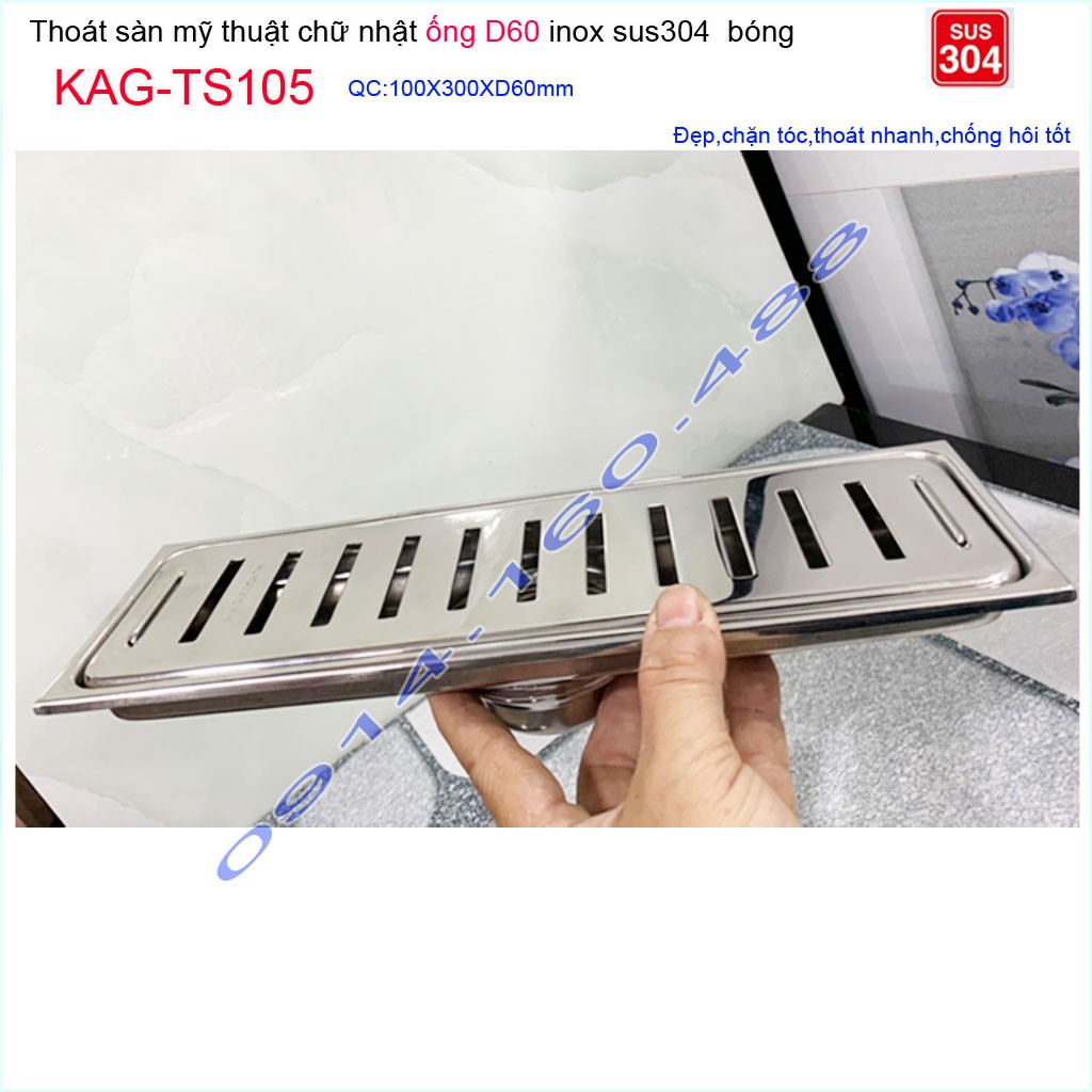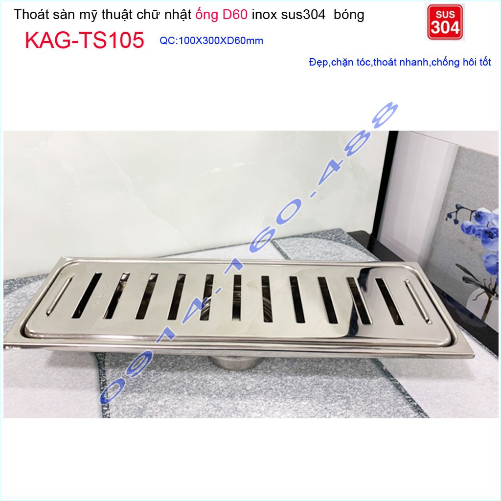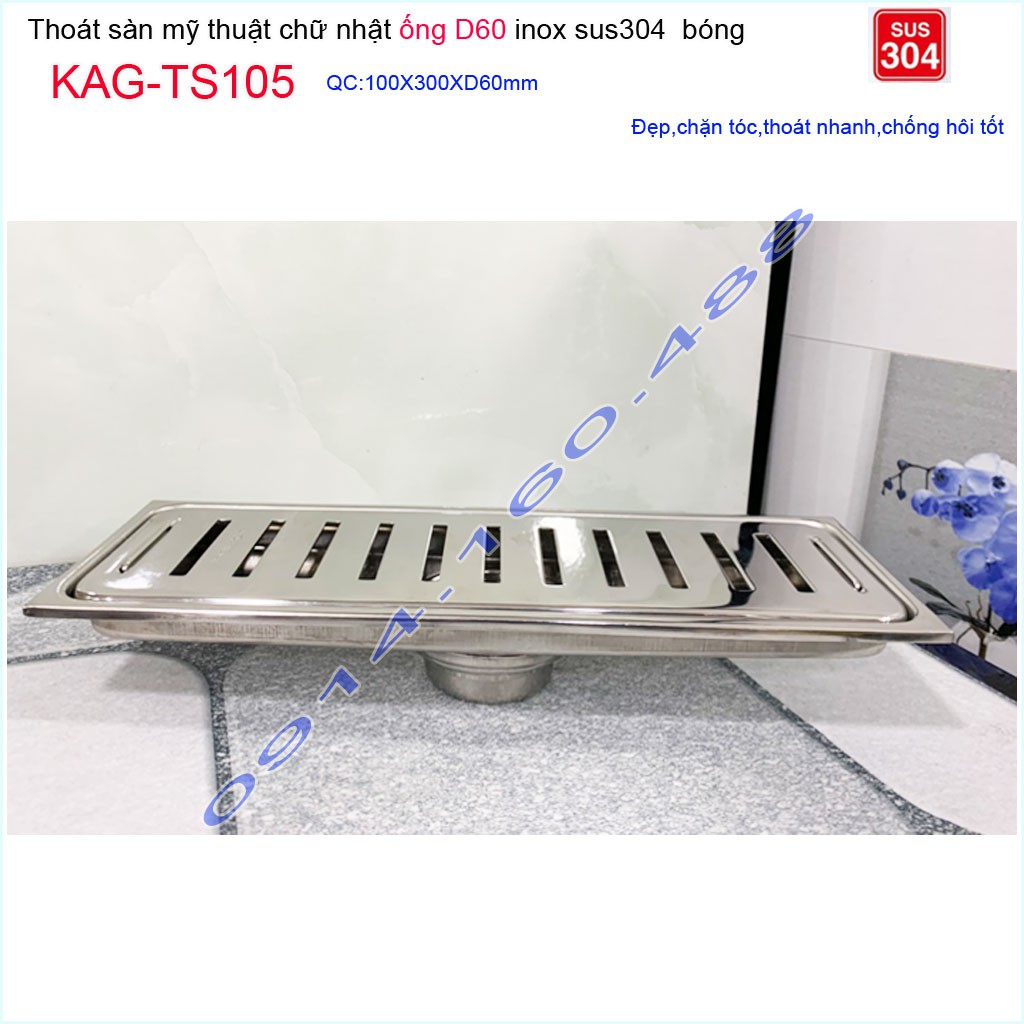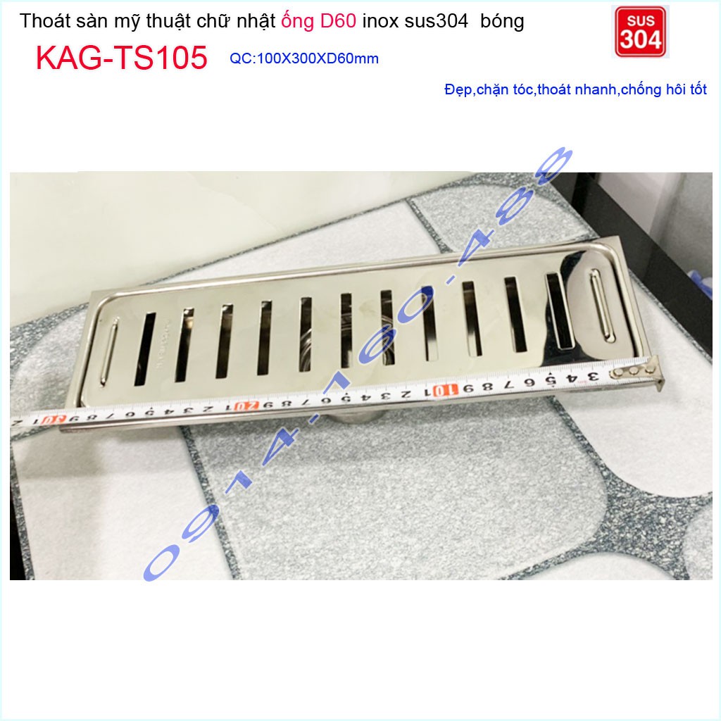 Thoát sàn 10x30cm KAG-TS105, Phễu thoát sàn dài mặt Sọc Inox SUS304 bóng dày đẹp thoát nhanh chặn tóc tốtKích thước 100mmx300mm ống D60