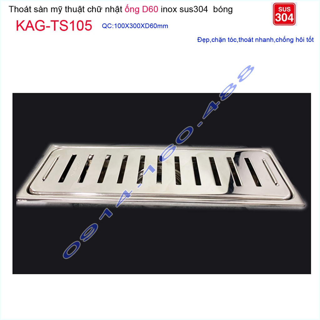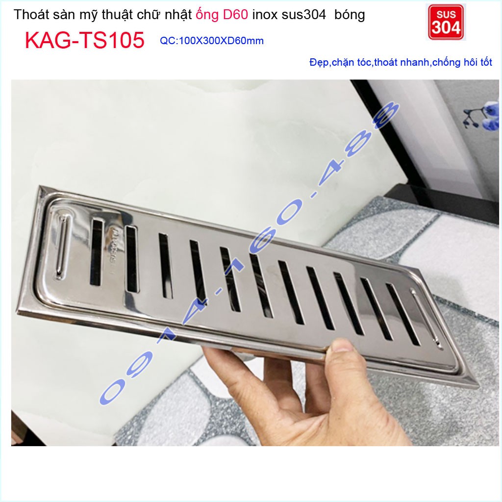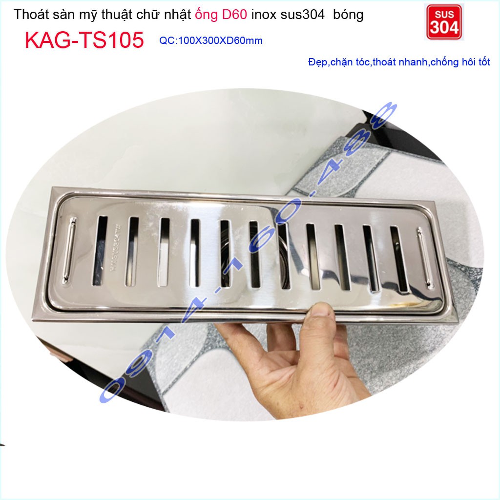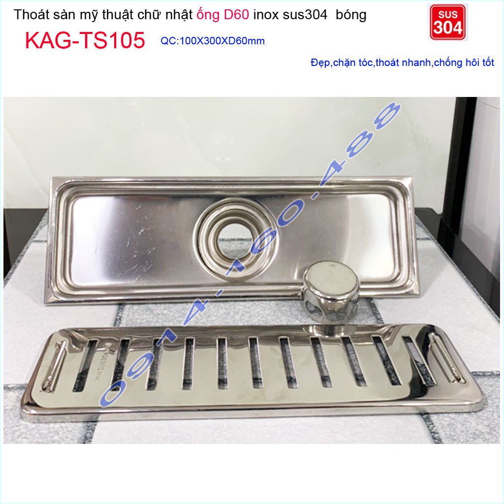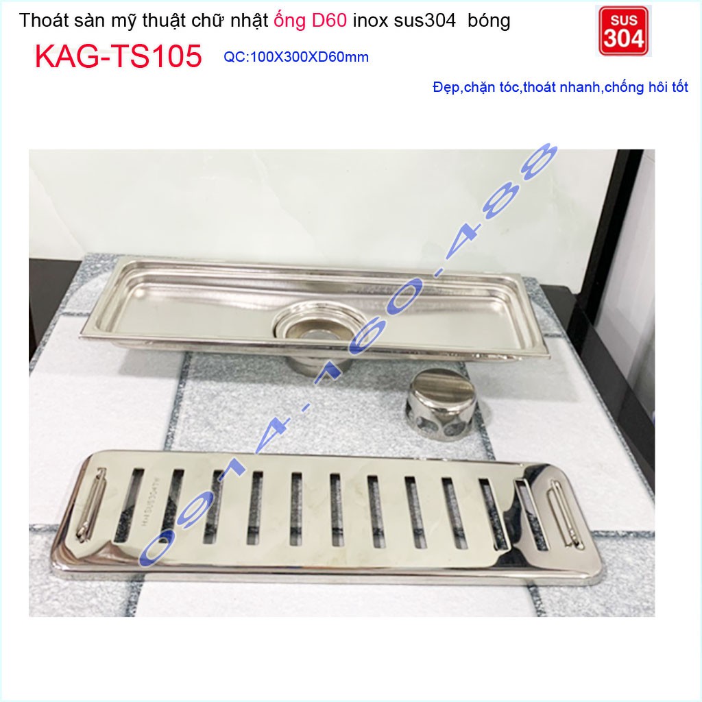 Thoát sàn 10x30cm KAG-TS105, Phễu thoát sàn dài mặt Sọc Inox SUS304 bóng dày đẹp thoát nhanh chặn tóc tốtKích thước 100mmx300mm ống D60