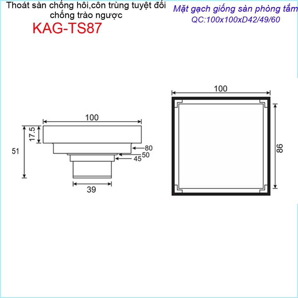 Kích thước mặt 10x10 cm : KAG-TS87( ống D49/60/90)