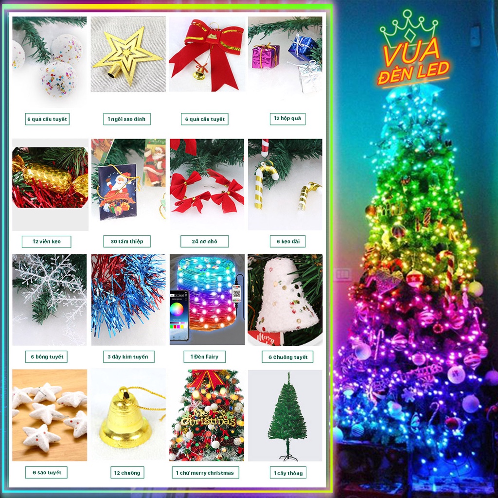 Nhà cửa & Đời sống > Trang trí nhà cửa > Khác || Cây thông Noel 1M5 đầy đủ phụ kiện kèm đèn fairy light 16 triệu màu điều khiển APP điện thoạiCòn hàng