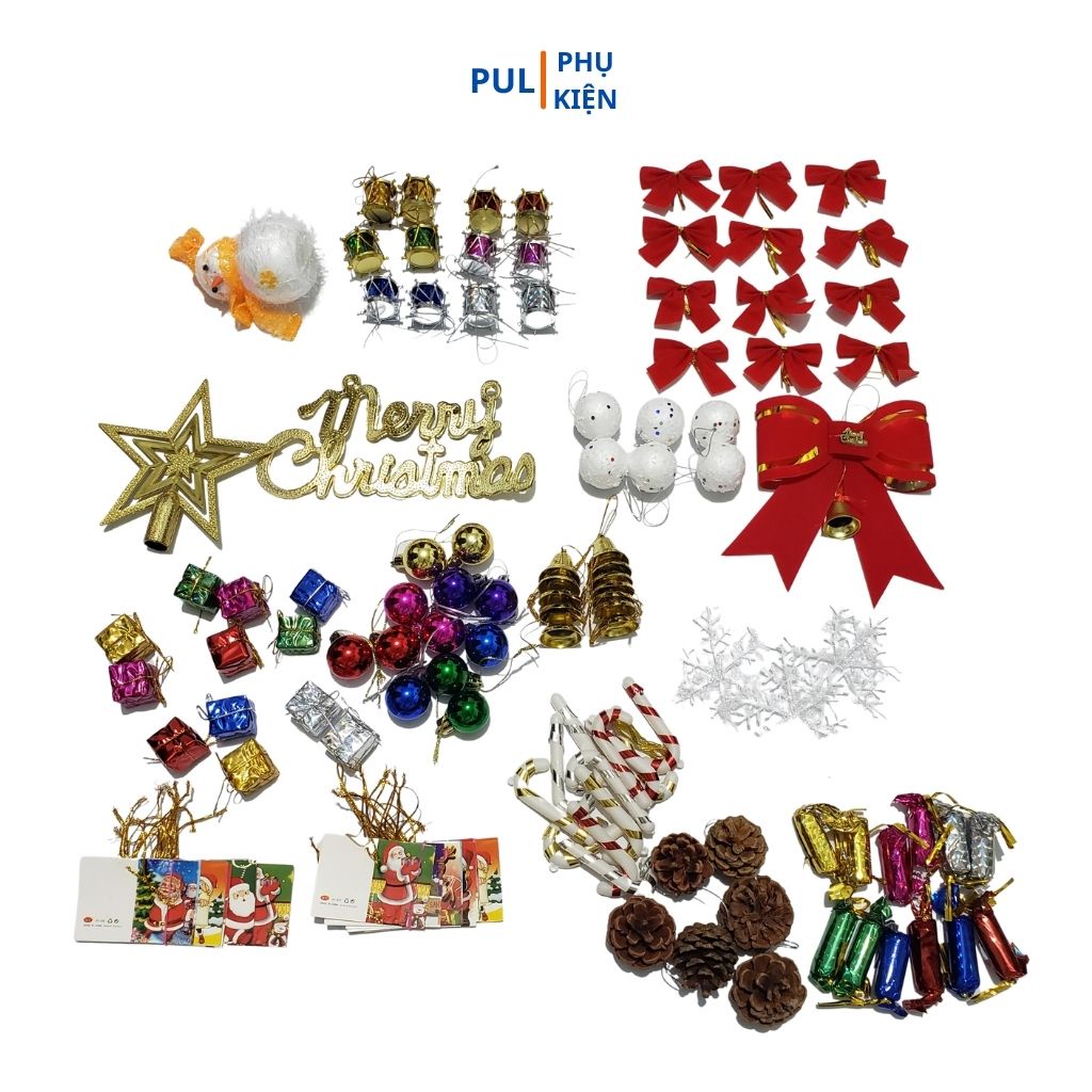 - Full phụ kiện: Gồm 1 cây thông noel + 1 dây đèn led + 1 túi phụ kiện từ 60-90 món (Lưu ý: Phụ kiện về nhiều đợt, nên có thể khác nhau vài món nhưng đảm bảo đủ số lượng)