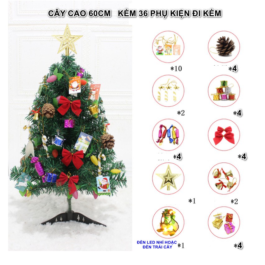 ** Sản phẩm gồm 1 cây thông cao 60cm và 1 bộ phụ kiện trang trí đi kèm. Cây cao 60cm + 36 phụ kiện (vui lòng tham khảo danh sách phụ kiện trên hình đăng)** Trong 1 số trường hợp hết hàng có thể thay thế 1 số ít phụ kiện khác so với thông tin, nhưng không ảnh hưởng đến số lượng và chất lượng phụ kiện.