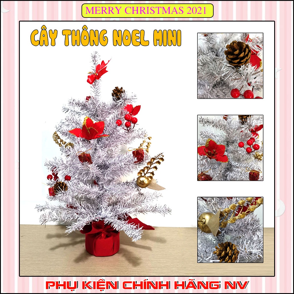 Cây thông noel để bàn 40cm, 52cm quà tặng trang trí giáng sinh hàng Việt Nam chất lượng cao trắng bạc đế nhựa bọc vải đỏCây thông noel mini để bàn là biểu tượng không thể thiếu trong mùa Giáng Sinh. Khi mùa đông đến, mọi cây cối đều héo úa, thì chỉ có cây thông noel là loài cây vẫn luôn tươi xanh, dáng vẻ mạnh mẽ dù cho khí hậu có khắc nghiệt. Vì thế, ngày lễ giáng sinh người ta hay dùng cây thông noel làm cây trang trí nhà cửa, phòng khách, phòng ngủ, bàn làm việc bởi ý nghĩa bất diệt và là biểu tượng của sự sống, no ấm phồn vinh, giúp xua đuổi tà ma, bệnh tật.