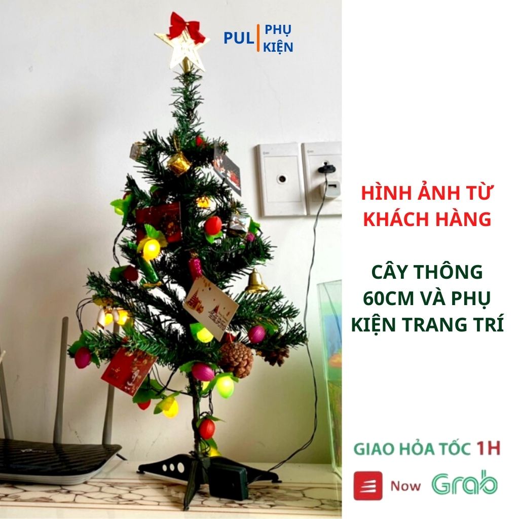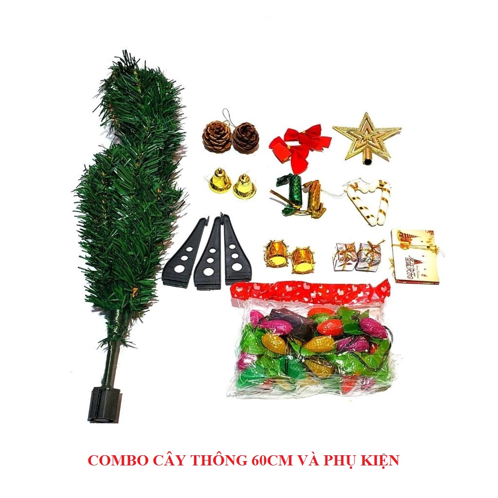 *Cthông+PK 64 món+Đèn: Gồm cây thông noel để bàn 90cm hoặc 1m2 kèm 1 ngôi sao đỉnh, 2 dây kim tuyến và dây đèn led 8m, 1 túi phụ kiện từ 60-65 món: hộp quà, thiệp nhỏ, nơ, quả thông,...