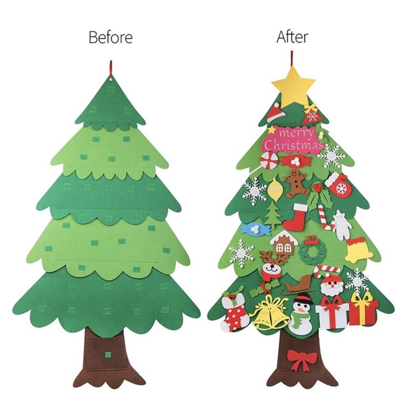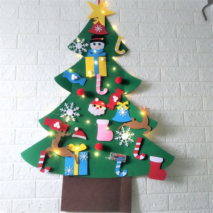 Bộ cây thông Noel bằng nỉ được đóng gói gấp, khi hàng về có thể bóc dán dễ dàng để hoàn thiện và sẵn sàng treo lên tường hoặc cửa