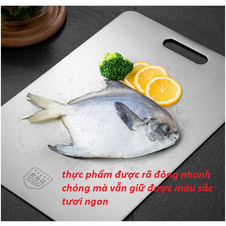 ***Thớt inox sạch sẽ dễ chùi rửa,có thể dùng rã đông thực phẩm nhanh chóng mà vẫn giữ được độ tươi ngon của thưc phẩm nhờ tính truyền nhiệt nhanh của kim loại (để thực phẩm cần rã đông lên thớt từ 10-20 phut là sẽ rã đông không cần phải ngâm trong nước).