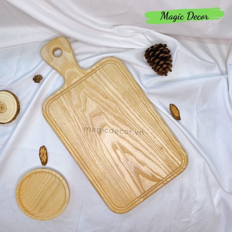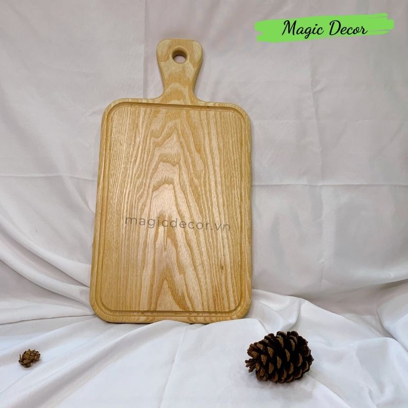 Thớt gỗ decor Magic trang trí hình chữ nhật có tay cầm gỗ tần bì đựng đồ ăn, trái cây sang trọng