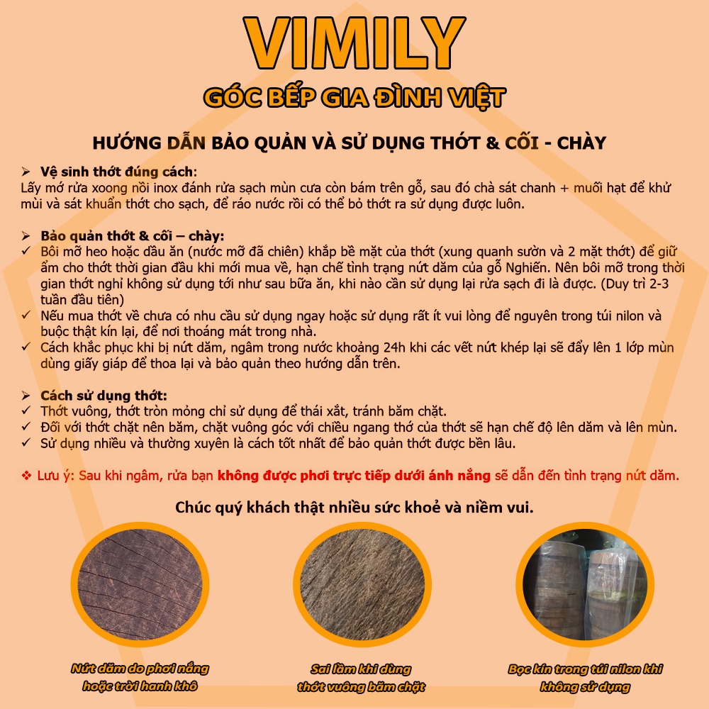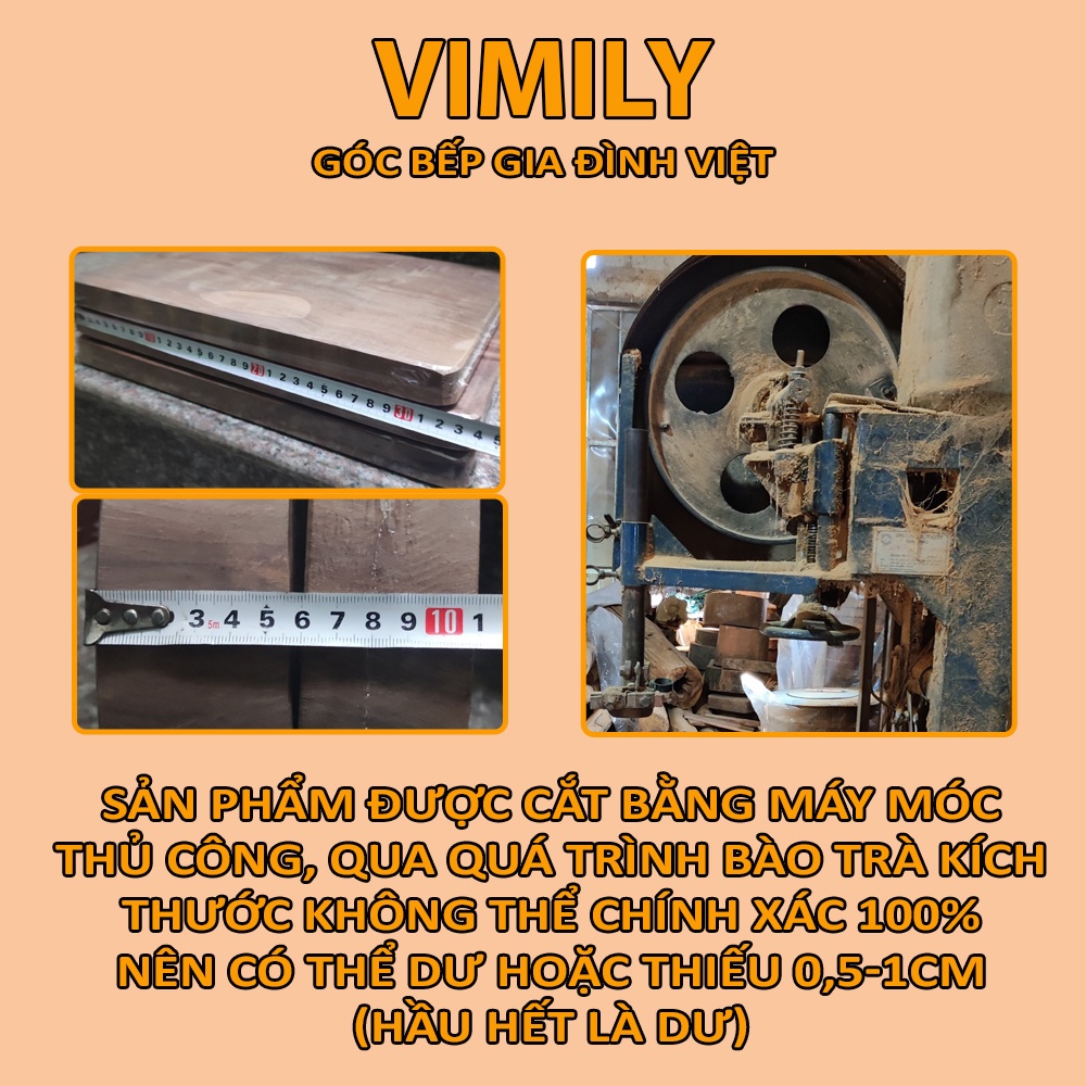 Thớt gỗ nghiến VIMILY sản xuất bằng máy móc thủ công kích thước độ dài có thể dư hoặc thiếu 0,5-1cm tùy theo kích thước từng bộ (đa số dư)