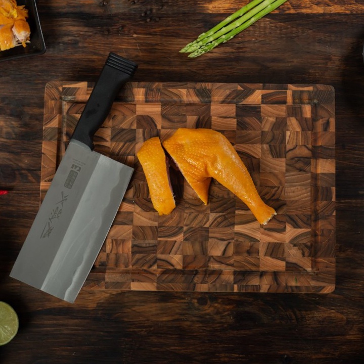 Thớt gỗ Teak đầu cây là chiếc thớt chất lượng siêu cấp được các đầu bếp khách sạn 5 sao sử dụng và được xuất hiện rất nhiều trên các chương trình nấu ăn nổi tiếng thế giới bởi chất lượng tuyệt vời và tính thẩm mỹ cực cao. Thớt có 2 loại độ dày: độ dày 2.5cm giúp thái, băm dễ dàng; Riêng độ dày 3.8cm có thể dùng thêm để chặt gà/sườn thoải mái.