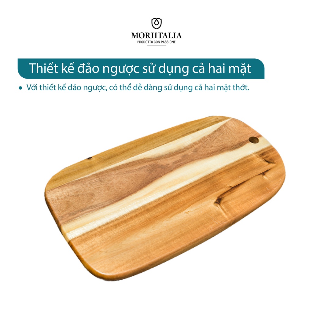 - Thớt gỗ Moriitalia không bị vết cắt sâu như các loại thớt khác, ngăn ngừa vi khuẩn mắc kẹt trên thớt, hoàn toàn sử dụng màu gỗ tự nhiên, không sơn phủ màu gỗ, an toàn cho người sử dụng. Với thiết kế đảo ngược, có thể dễ dàng sử dụng cả hai mặt thớt.