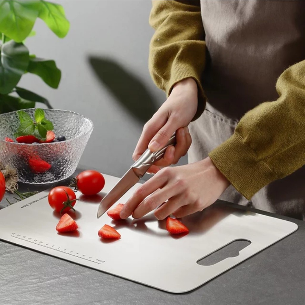 - Thớt inox thoải mái xử dụng không sợ bị rơi võ như thớt kính. bề mặt inox có độ lì nhất định nên khi cắt thái không bị trơn như thớt kính.