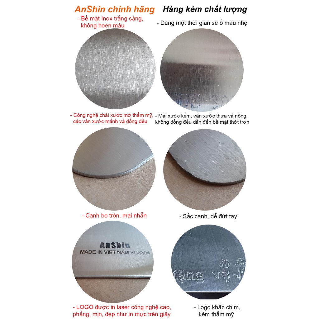 LƯU Ý: hiện nay có rất nhiều bên đang ăn cắp hình ảnh và video của ANSHIN rồi chỉnh sửa, xóa bỏ logo của ANSHIN để bán hàng giả, hàng kém chất lượng. Vì vậy, khách hàng lưu ý: tất cả các sản phẩm thớt của ANSHIN đều có in laser logo thương hiệu "ANSHIN - MADE IN VIỆT NAM SUS 304'' trên sản phẩm để khách hàng có thể nhận biết đâu mới là hàng chính hãng ANSHIN ạ. Ngoài ra, logo thương hiệu của ANSHIN sử dụng công nghệ IN LASER (sờ vào sẽ thấy mịn và phẳng như in mực trên giấy) chứ không phải KHẮC laser (logo khắc chìm sâu xuống dưới bề mặt thớt tạo thành khe rãnh, sờ vào sẽ thấy thô, giáp). Qúy khách cũng lưu ý ảnh chụp thật của sản phẩm để phân biệt hàng ANSHIN chính hãng và hàng thủ công kém chất lượng ạ.