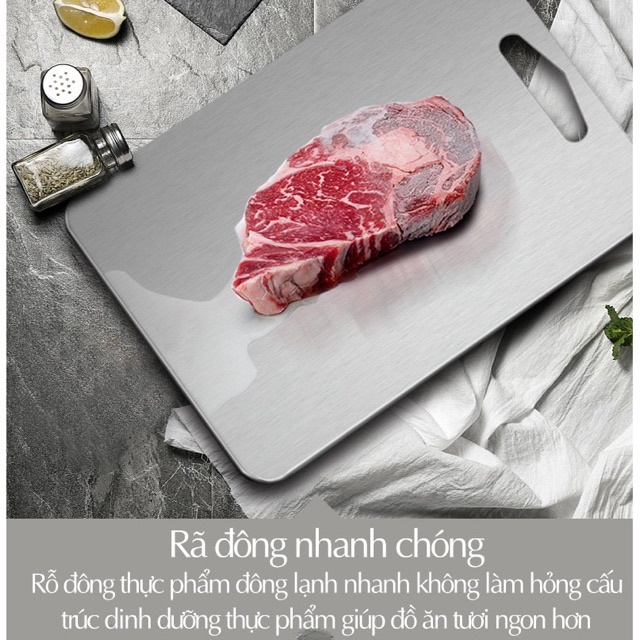 - Thớt inox hạn chế được mọi nhược điểm của thớt gỗ là hay bị ẩm và mốc, thớt inox vừa nhỏ gọn nhẹ, lại luôn sạch sẽ. Chưa kể các mẹ có thể dùng mặt thớt để rã đông đồ ăn rất nhanh