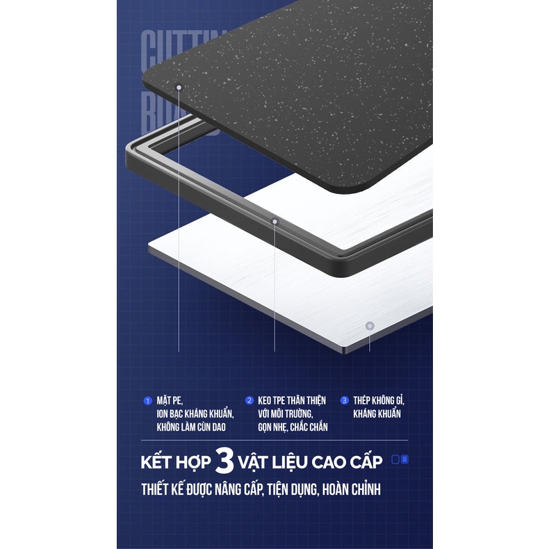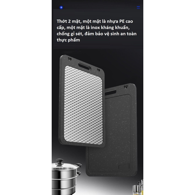 Thớt kháng khuẩn 2 mặt- Nhựa PP và inox 304 cao cấp có mặt trước sử dụng nhựa PP kháng khuẩn, có độ dẻo dai tốt, hạn chế mòn dao, khó để lại vết xước và dễ dàng vệ sinh lau chùi. Đặc biệt là giảm tiếng ồn khi băm chặt thực phẩm. Mặt sau thớt sử dụng chất liệu inox 304 cao cấp thích hợp khi thái, vệ sinh thực phẩm tươi sống, dễ bám mùi như thịt bò, cá...