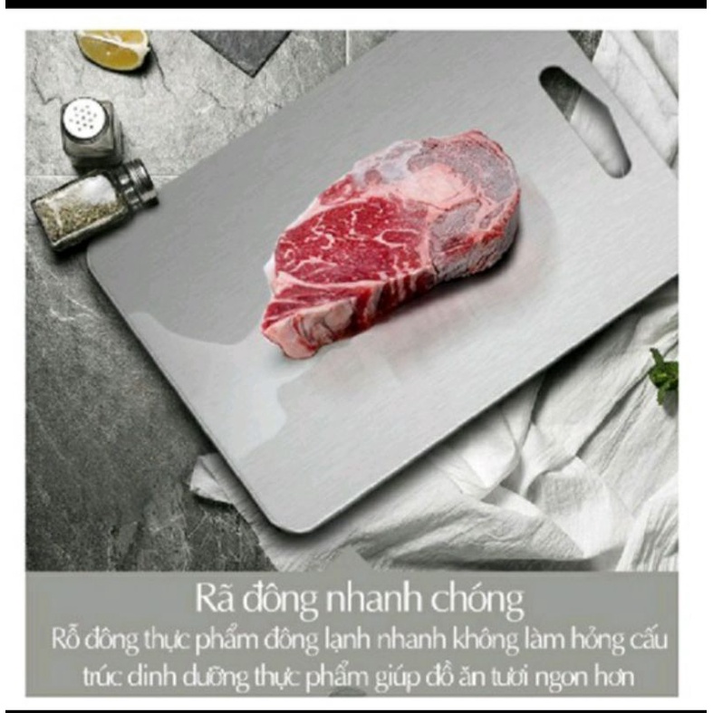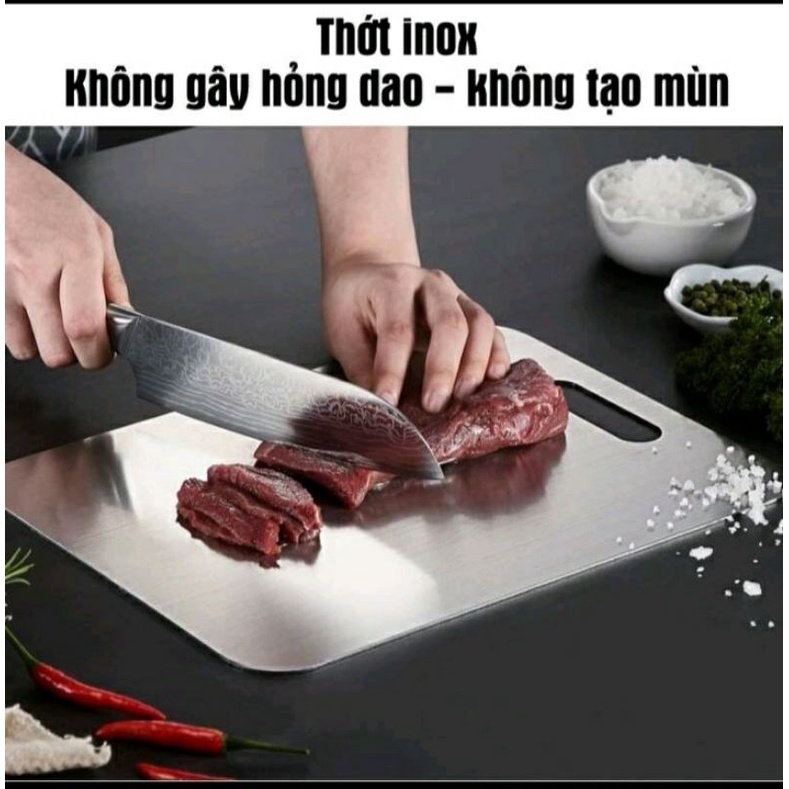 - Thớt inox hạn chế được mọi nhược điểm của thớt gỗ là hay bị ẩm và mốc, thớt inox vừa nhỏ gọn nhẹ, lại luôn sạch sẽ. Chưa kể các mẹ có thể dùng mặt thớt để rã đông đồ ăn rất nhanh