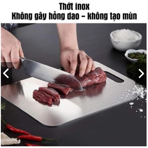 Thớt inox hạn chế được mọi nhược điểm của thớt gỗ là hay bị ẩm và mốc, thớt inox vừa nhỏ gọn nhẹ, lại luôn sạch sẽ. Chưa kể các mẹ có thể dùng mặt thớt để rã đông đồ ăn rất nhanhThông số kĩ thuật: