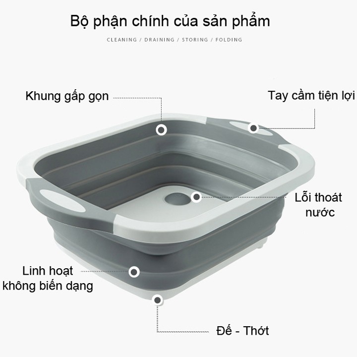 Với chất liệu nhựa cứng PP và silicol dẻo dai chỉ cần kéo tuột lên chiếc thớt thái chặt đồ của b sẽ thành chiếc chậu rửa, và 1 chiếc rổ đựng đồ tiện lợi