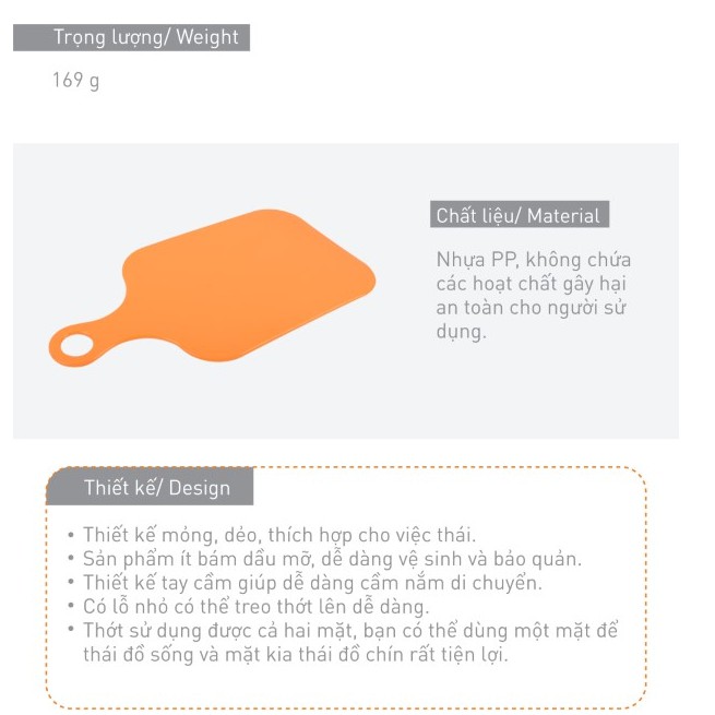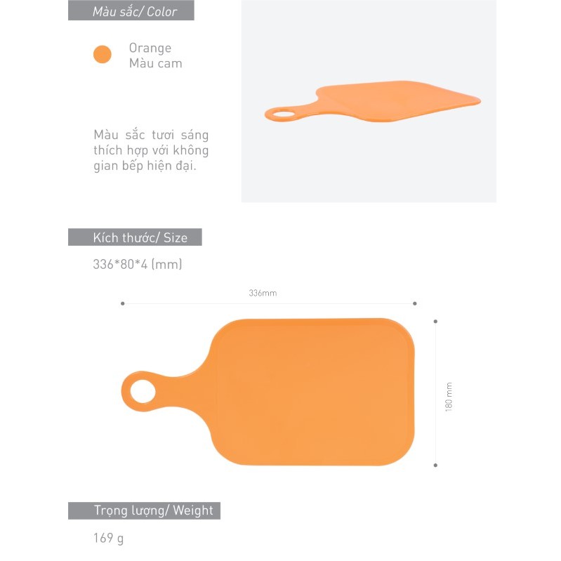 Với sự tiện lợi, đa năng của sản phẩm, chúng tôi tin chắc sản phẩm sẽ mau chóng chiếm được cảm tình, sự yêu thích từ phía người dùng, bất kể là người lớn hay trẻ nhỏ, đều sẽ yêu thích sự hữu dụng của Thớt nhựa có tay cầm này