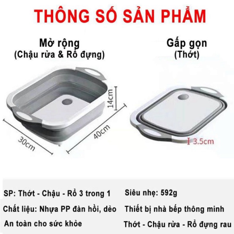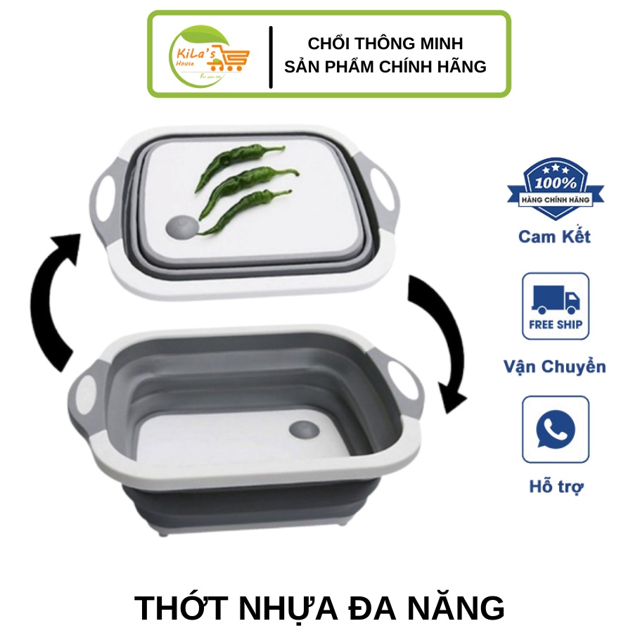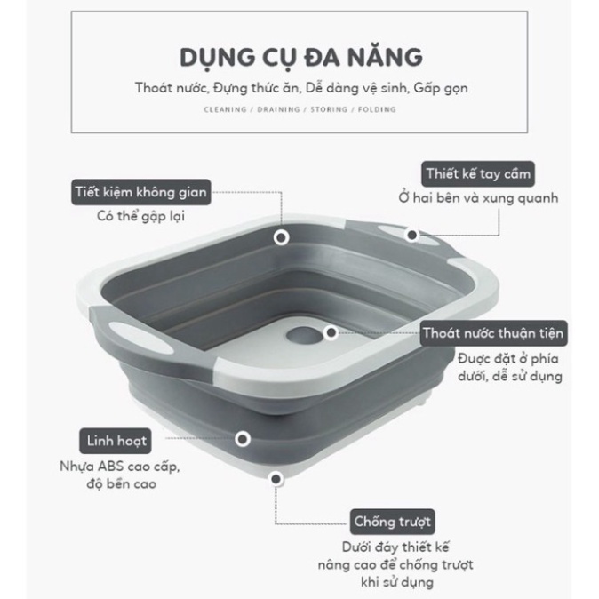 - Sản phẩm hướng tới một xu hướng gọn nhẹ và đa dụng cho căn bếp của bạn. Một chiếc chậu rửa gấp gọn hay một cái thớt nhựa có thể biến thành chậu rửa. Đây là một sản phẩm vô cùng tiện lợi và đa năng cho các chị em nội trợ. Sản phẩm được làm bằng nhựa và cao su cao cấp an toàn cho sức khỏe người sử dụng. Có độ bền cao.