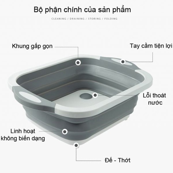 + THỚT: Khi gập lại dùng làm thớt để thái rau củ quả, thịt, cá.Thiết kế chống trượt được đặt trên bề mặt, thuận tiện để cắt thực phẩm mà không bị trượt.