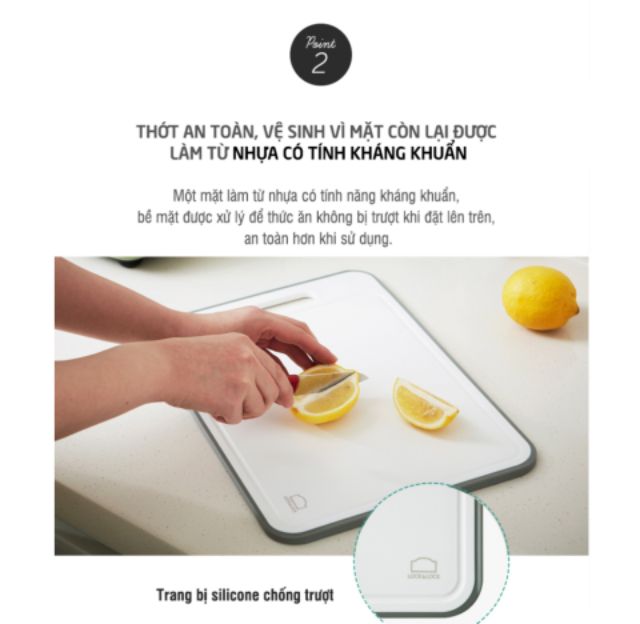 - Ở mặt sau, thớt được làm từ nhựa kháng khuẩn cao cấp và có thể được sử dụng để cắt thái trái cây, rau củ, thực phẩm ...