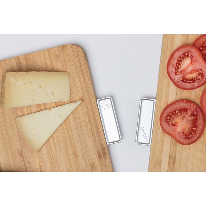 - Có tab kiểu chỉ mục cho biết loại thực phẩm nào nên được sử dụng với thớt nào - thịt sống, thực phẩm nấu chín hoặc rau, củ quả.