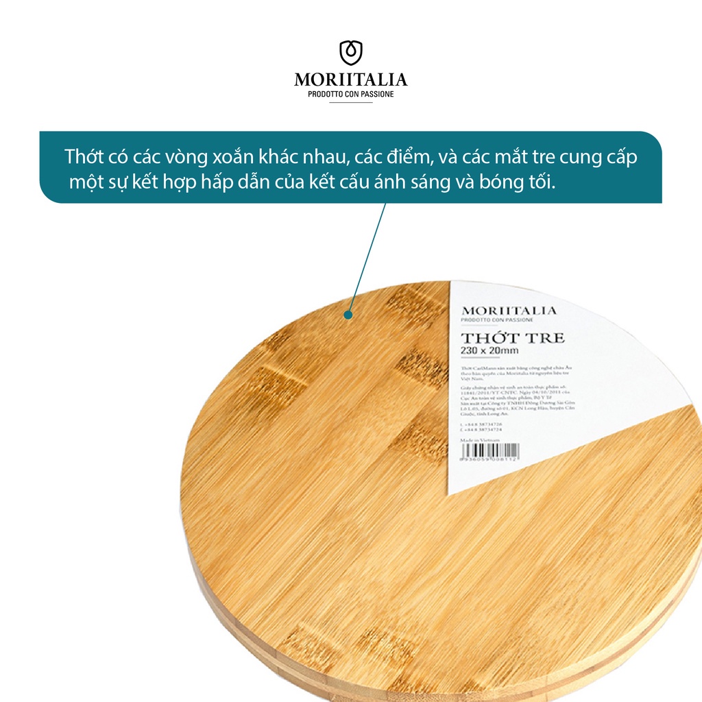 - Thớt tre Moriitalia kết hợp hoàn hảo công nghệ Châu Âu (Cộng Hòa Pháp) và tre Việt Nam, với thiết kế bắt mắt, tính thẩm mỹ cao. Sản phẩm thớt tre Moriitalia cao cấp vốn được sử dụng để chế biến món ăn tại các nhà hàng khách sạn tại Châu Âu, Mỹ và Nhật.