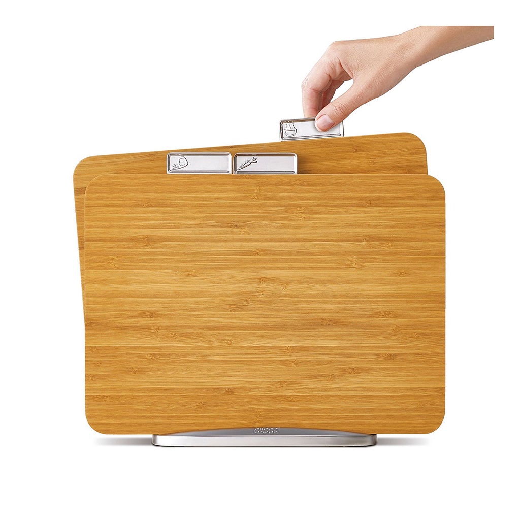 - Bộ Thớt tre Joseph Joseph Index Bamboo bao gồm ba thớt dành riêng cho thực phẩm với giá đỡ bằng kim loại chắc chắn. Thớt tre Joseph Joseph được làm từ tre tự nhiên, cứng và có ký hiệu dùng riêng cho từng loại thực phẩm nào nên được sử dụng , thịt sống, thực phẩm nấu chín hoặc rau. Mỗi khe cắm bảng an toàn trên giá đỡ kim loại cũng có chân chống trượt.
