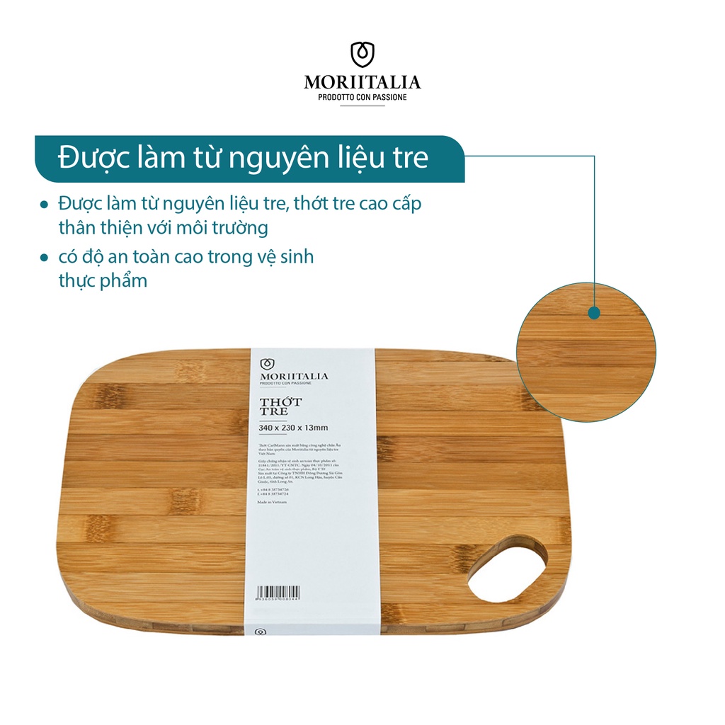 - Thớt tre Moriitalia kết hợp hoàn hảo công nghệ Châu Âu (Cộng Hòa Pháp) và tre Việt Nam. Sản phẩm thớt tre Moriitalia cao cấp vốn được sử dụng để chế biến món ăn tại các nhà hàng khách sạn tại Châu Âu, Mỹ và Nhật.