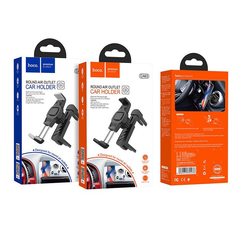 Giá kẹp điện thoại HOCO CA63 dạng tay kẹp, gắn cửa gió điều hòa hình tròn trên ô tô, đế xoay 360 độ, tay kẹp rất chắc chắn và có đệm cao su chống xước điện thoại