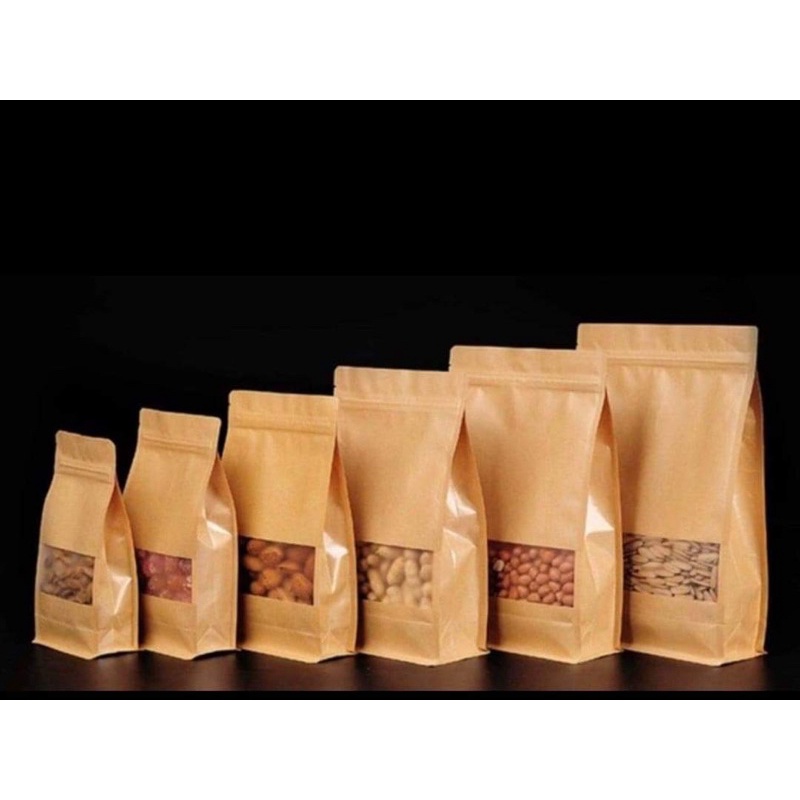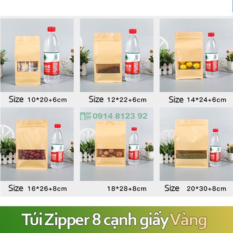 Giới thiệu {Thử mẫu 1 cái/ size} Túi zipper giấy Kraft Vàng 8 CẠNH đáy đứng cửa sổ tràn có CÁN MÀNG - CHỐNG THẤM NƯỚC (sp y hình)